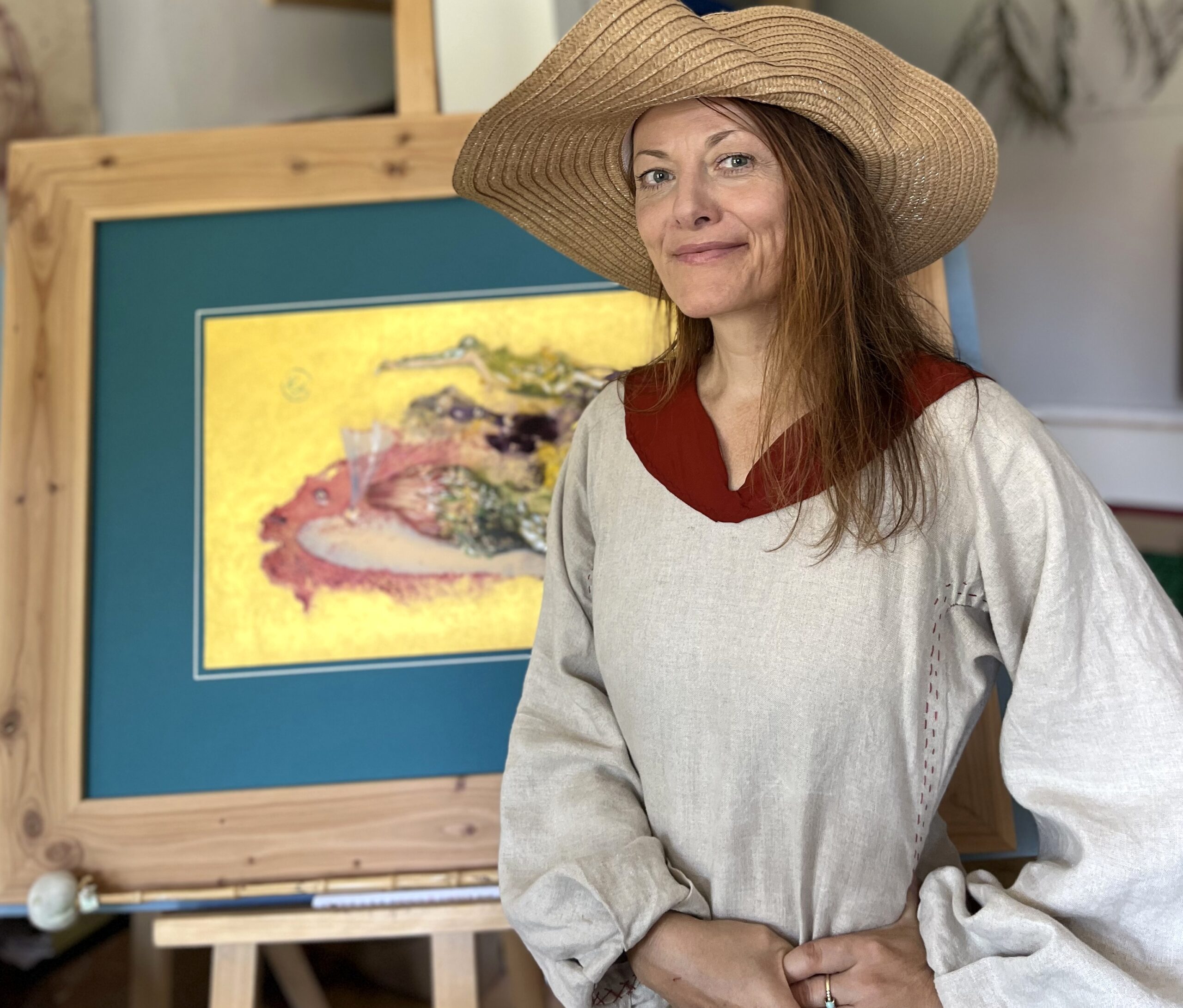 Ich arbeite mit wasserlöslichen Farben, Pflanzensäften oder Tee und Kaffee auf verschiedenen Papieren und Kartons. Aus Farbverläufen, die auf verschiedenen Wegen – wie etwa Frottagen – entstehen, lösen sich vor meinem Auge Wesen und ganze Szenen, die ich mit Stift und Pinsel manifestiere, so daß sie auch andere sehen können. Sie finden mich, weil sie wissen, daß ich weiß, daß sie da sind. Manche dieser so geschaffenen Welten verlangen nach einem goldenen Hintergrund, andere brauchen gar keinen.